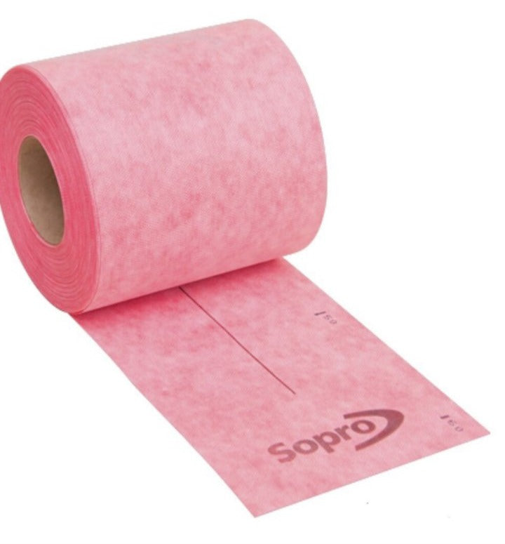 Flexibles Dichtband, beidseitig mit einem speziellen Vliesgewebe beschichtet, zur sicheren, flexiblen und wasserundurchlässigen Überbrückung von Anschluss- und Bewegungsfugen in Kombination mit flüssig zu verarbeitenden und bahnenförmigen Sopro Abdichtungsstoffen unterhalb keramischer Fliesen und Platten sowie von Naturwerksteinbelägen.